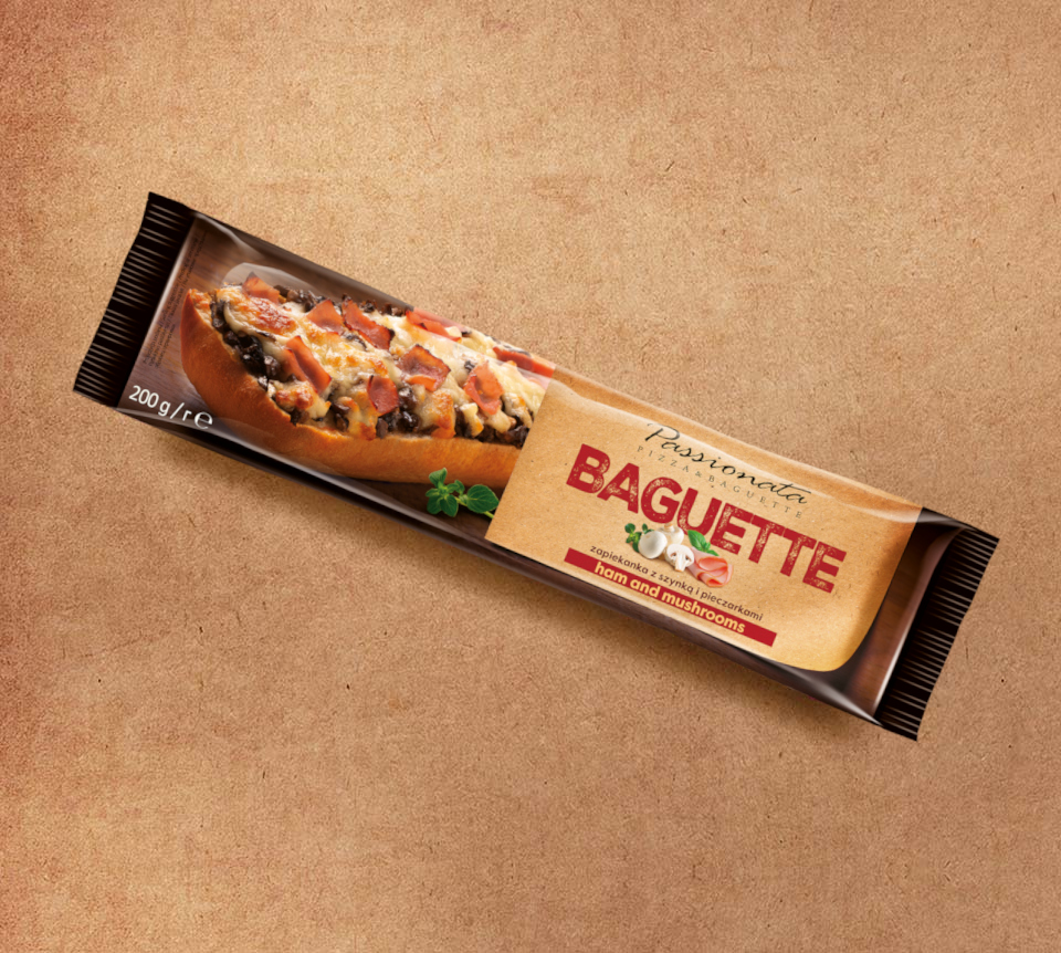 Baguette with button mushrooms and onion stuffing, on a pre-baked baguette. Quick-frozen. Ready to be consumed after heat treatment.
